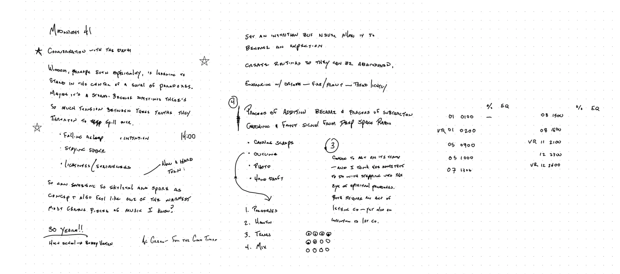 There's a lot of displacement in tonight's tribute: hard cuts, truncated tracks, and rips of static—but I've savored the past two weeks I've spent immersed in these songs. When I listen to them today, I hear the wild sense of play that only emerges from routine and parameters; I think about the commitment to a regular cadence that teaches one to live with imperfect results. Most of all, these tracks succeed because they are a dialogue with the listener: they stake out a rigid framework so expectations can be fucked with. The spiritualized zone lives in the delightful space between what I think will happen and what actually occurs.
