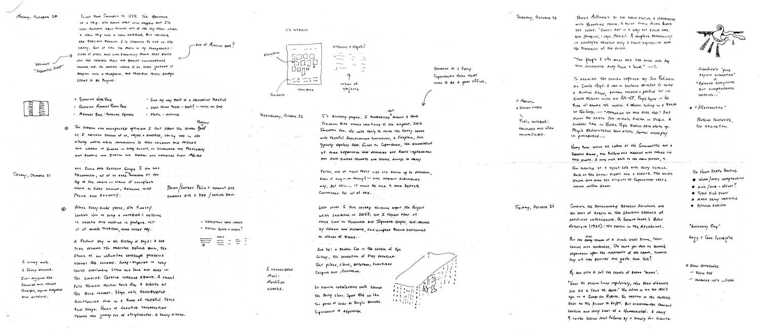 I’m finally learning how to keep a notebook: nothing is sacred and nothing is profane. Let it all blur together, the ruminations and hopeful plans and overheard phrases and client work and memories of my parents and shopping lists and aspirational routines and things to look up later and ideas for new songs to reverberate.